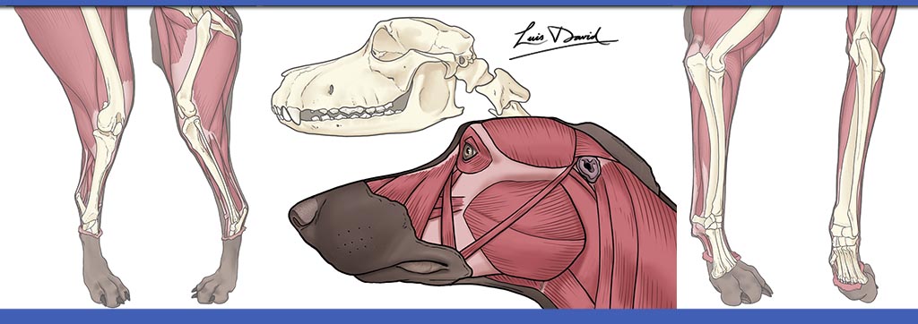 La escuela de formación continuada IACES nos encarga unos dibujos sobre la anatomía canina. Tras decidir que tipo de raza de perro quieren mostrar, iniciamos los trabajos realizando la exposición de un turn around del can buscando la conexión de los puntos subcutáneos como referencia para la colocación de huesos y tener un punto de partida.